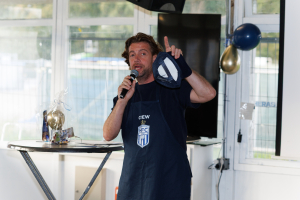 Na de hamburger volgde een Volendams getinte quiz, met Mitchel Michaelis en Gerry Vlak als topquizmasters. Met echte HFC-petjes was het natuurlijk: petje op, petje af! Goeie vragen over het aankomende voetbalkamp mochten uiteraard niet ontbreken.
